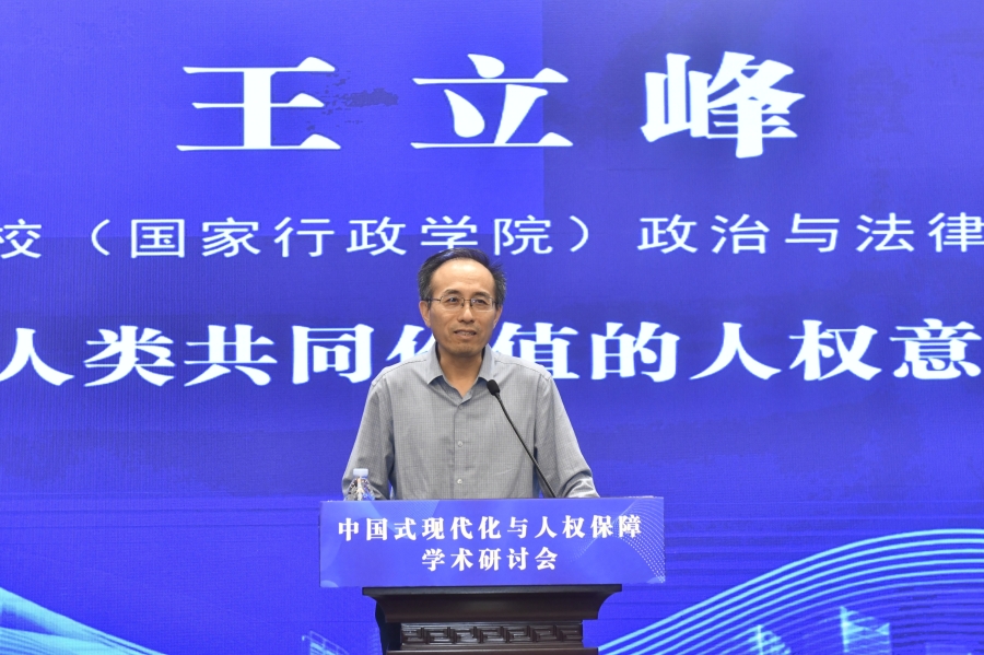 “中國(guó)式現(xiàn)代化與人權(quán)保障”學(xué)術(shù)研討會(huì)16日在山東濟(jì)南舉行。圖為中共中央黨校(國(guó)家行政學(xué)院)政治與法律教研部教授王立峰作題為《全人類共同價(jià)值的人權(quán)意涵》的大會(huì)發(fā)言。主辦方供圖