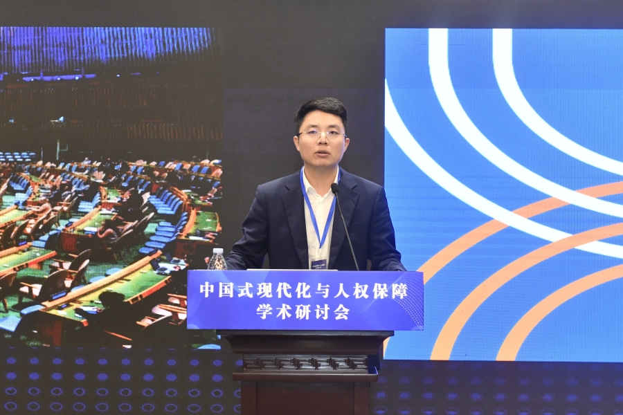 “中國(guó)式現(xiàn)代化與人權(quán)保障”學(xué)術(shù)研討會(huì)16日在山東濟(jì)南舉行。圖為華東政法大學(xué)人權(quán)研究院特聘副研究員陳斌作題為《全球數(shù)字契約時(shí)刻人權(quán)治理的中國(guó)方案》的大會(huì)發(fā)言。主辦方供圖