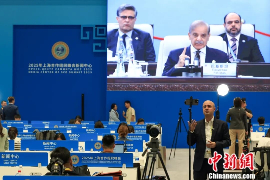 2025年9月1日,天津,外國記者在2025年上海合作組織峰會新聞中心進行直播。中新社記者 佟郁 攝