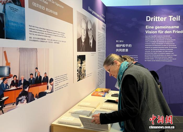 當?shù)貢r間9月29日,“世界記憶 和平愿景——約翰·拉貝等德國人士見證的南京大屠殺”主題展覽在柏林中國文化中心開幕。圖為觀眾觀展。中新社記者 馬秀秀 攝