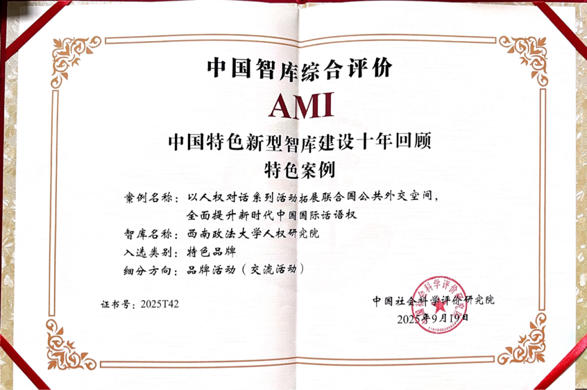 2025年9月19日,在中國(guó)社會(huì)科學(xué)評(píng)價(jià)研究院主辦的“中國(guó)智庫(kù)綜合評(píng)價(jià)(AMI)”評(píng)選中,西南政法大學(xué)人權(quán)研究院《以人權(quán)對(duì)話系列活動(dòng)拓展聯(lián)合國(guó)公共外交空間,全面提升新時(shí)代中國(guó)國(guó)際話語(yǔ)權(quán)》入選“中國(guó)特色新型智庫(kù)建設(shè)十年回顧特色案例”,獲評(píng)特色品牌·品牌活動(dòng)(交流活動(dòng))。