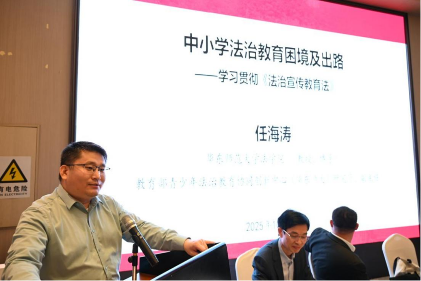 華東師范大學(xué)法學(xué)院、教育部青少年法治教育協(xié)同創(chuàng)新中心(華東師范大學(xué))副主任任海濤教授作題為《中小學(xué)法治教育困境及出路——學(xué)習(xí)貫徹〈法治宣傳教育法〉》的主旨報告。任海濤教授指出,當(dāng)前的中小學(xué)法治教育中,照本宣科、教材不適配、法治教師隊伍的培養(yǎng)發(fā)展等問題突出,亟需找尋中小學(xué)法治教育的改革出路。當(dāng)前,以華東師范大學(xué)為實踐范例,構(gòu)建出完整的法治教育科學(xué)體系,可為當(dāng)前中小學(xué)法治教育提供參考。