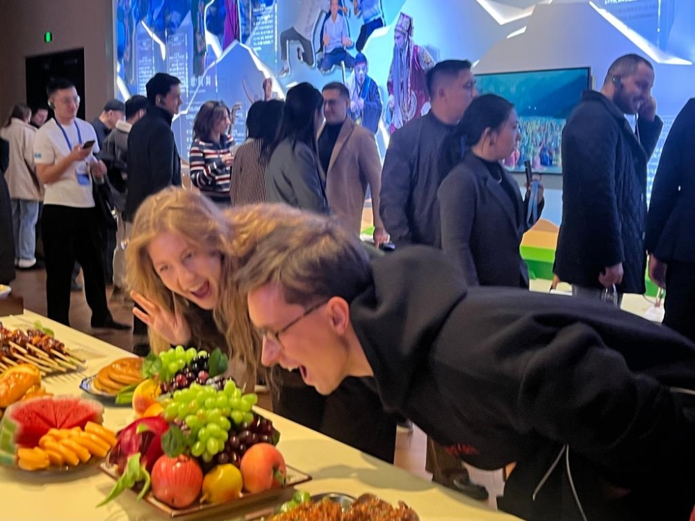 在新疆非物質(zhì)文化遺產(chǎn)館,展示的新疆各民族美食、習(xí)俗、樂(lè)器等,令來(lái)自白俄羅斯的達(dá)莉婭·海杜克和季莫費(fèi)·庫(kù)爾切諾克興致盎然。