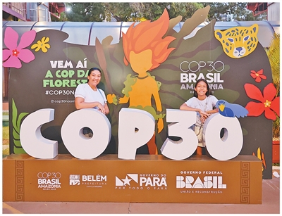 游客在巴西貝倫的COP30主題裝飾物旁拍照。本報記者 時元皓攝