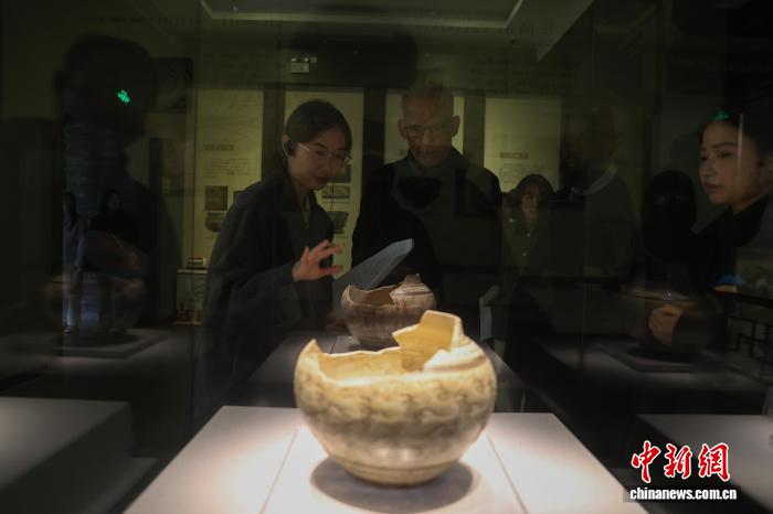圖為中外嘉賓在中國(guó)吉州窯博物館內(nèi)參觀(guān)展出的吉州窯釉下褐彩波濤紋罐。中新社記者 劉力鑫 攝