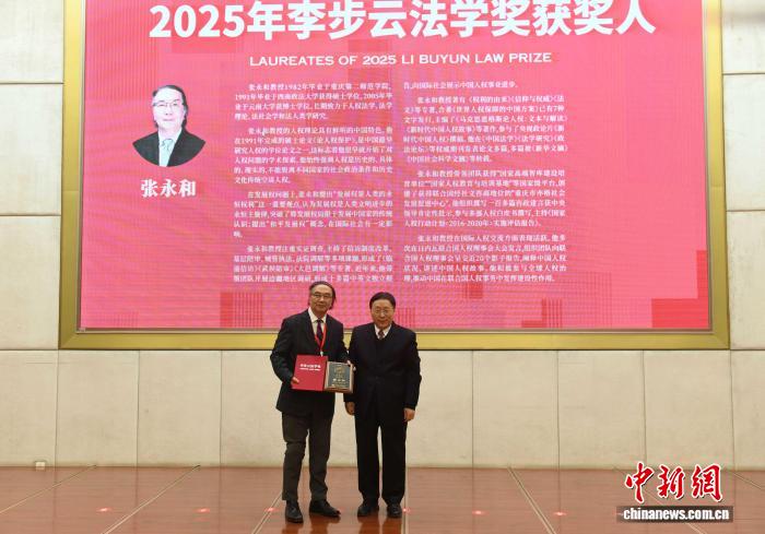圖為西南政法大學人權(quán)研究院執(zhí)行院長張永和(左)獲頒2025年李步云法學獎。中新網(wǎng)記者 周毅 攝