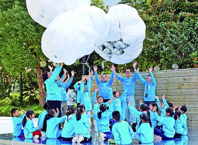 在上海浦東美術館,孩子們與設計師團隊共同打造并升起“氣候云”藝術裝置。新華社發(fā)