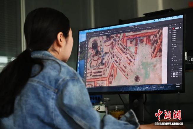 2024年6月5日,甘肅省敦煌市,敦煌研究院文物數(shù)字化研究所科研樓內(nèi),工作人員進(jìn)行數(shù)字化圖像拼接處理。中新社記者 李亞龍 攝