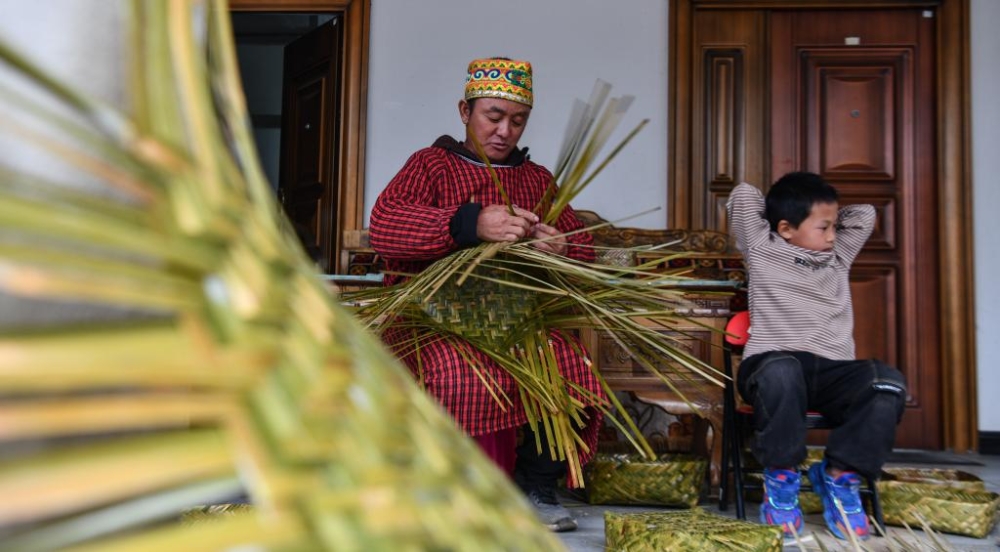 巴登村村民新向東在家編織竹筐(2022年4月15日攝)。新華社記者 晉美多吉 攝
