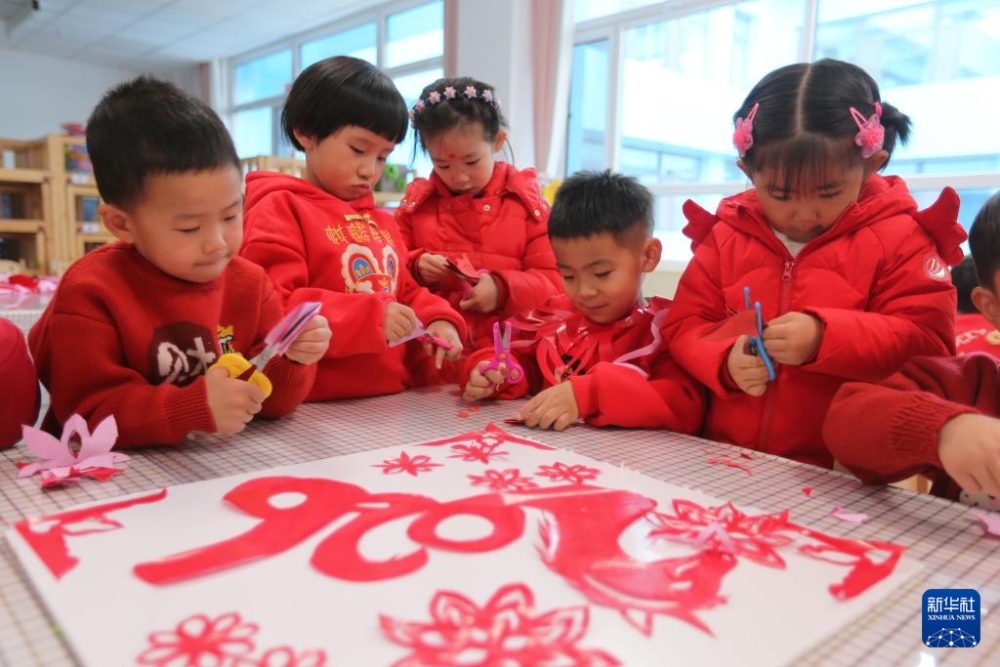 12月29日,河南省焦作市溫縣第三幼兒園的小朋友在進行迎新年剪紙創(chuàng)作。新華社發(fā)(黃福興攝)