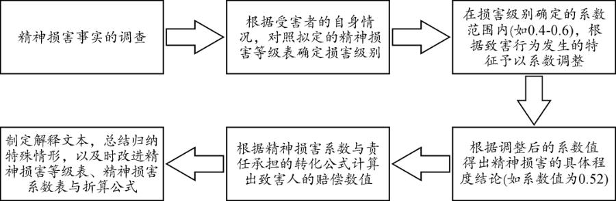 第一,針對(duì)附帶人身?yè)p害的精神損害,我國(guó)需要確立專(zhuān)門(mén)的環(huán)境侵權(quán)精神損害認(rèn)定規(guī)則,以司法解釋的方式加以規(guī)范化,或是充實(shí)《最高人民法院關(guān)于確定民事侵權(quán)精神損害賠償責(zé)任若干問(wèn)題的解釋》等已有規(guī)范的認(rèn)定規(guī)則,以發(fā)揮理想的引導(dǎo)作用。一方面,我國(guó)可參照域外對(duì)精神損害的分級(jí)經(jīng)驗(yàn),將環(huán)境侵權(quán)精神損害與醫(yī)學(xué)鑒定結(jié)論相結(jié)合。例如,視受害者的生活、工作狀態(tài)與心理測(cè)驗(yàn)結(jié)果,將相應(yīng)的精神損害分為“足以影響生活的精神焦慮、可被醫(yī)學(xué)認(rèn)定的精神創(chuàng)傷、可逆轉(zhuǎn)的精神疾病、不可逆轉(zhuǎn)的精神疾病”等級(jí)別,不同級(jí)別內(nèi)部也可視醫(yī)學(xué)診斷結(jié)論而區(qū)分出若干子級(jí),從而與非精神損害分離,避免片面依照普通傷害標(biāo)準(zhǔn)而掩蓋精神損害的特質(zhì)。另一方面,對(duì)醫(yī)學(xué)領(lǐng)域已經(jīng)確認(rèn)的精神損害級(jí)別結(jié)論,需要考慮修復(fù)相應(yīng)損害所需要的環(huán)境條件及受害者的精神狀態(tài)恢復(fù)規(guī)律,得出與責(zé)任程度直接對(duì)應(yīng)的精神損害系數(shù)。在將相應(yīng)系數(shù)折算為精神損害賠償量的過(guò)程中,應(yīng)當(dāng)注意設(shè)定合理的賠償上限與下限,避免因?yàn)楸稊?shù)效應(yīng)而導(dǎo)致賠償負(fù)擔(dān)過(guò)重或過(guò)輕。具體而言,可由醫(yī)學(xué)工作者、司法工作者、社會(huì)學(xué)專(zhuān)家、心理學(xué)專(zhuān)家等群體共同評(píng)估不同級(jí)別的精神損害,綜合得出損害數(shù)值。例如,對(duì)最嚴(yán)重的精神損害情形,損害賦值為1;對(duì)完全沒(méi)有受到干擾的情形,損害賦值為0。其余級(jí)別的精神損害可在此區(qū)間內(nèi),根據(jù)所屬的損害情形與恢復(fù)難度,被賦予不同的損害值。特定的敏感因素(如受害者的年齡、性別、被破壞環(huán)境的生態(tài)地位)可作為額外考慮的升值條件,在合理的情況下添加,進(jìn)而根據(jù)該系數(shù),折算出需要賠付的金錢(qián)數(shù)額(流程見(jiàn)圖1)。