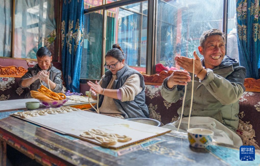 2月5日,玉麥鄉(xiāng)村民在家里做卡塞(一種傳統(tǒng)油炸面食),迎接即將到來(lái)的藏歷新年。新華社記者 丁增尼達(dá) 攝