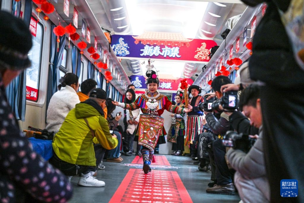 新春將至,貴州貴陽開往玉屏的5640次“慢火車”裝飾一新,喜慶的車廂、新鮮的農(nóng)產(chǎn)品、特色民族歌舞、精美非遺展示等讓這趟穿行于苗鄉(xiāng)侗寨的山區(qū)“慢火車”載滿濃濃的新春年味。