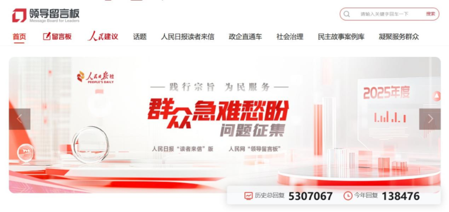 人民網(wǎng)“領(lǐng)導(dǎo)留言板”是《人民日?qǐng)?bào)》專門為中央部門與地方各級(jí)黨委政府搭建的網(wǎng)上群眾工作平臺(tái)。通過(guò)該平臺(tái),群眾可直接向中央各部門與各地黨委和政府留言發(fā)表意見(jiàn)建議,已覆蓋中央各部門、31個(gè)?。ㄗ灾螀^(qū)、直轄市)及其所轄市縣。作為全過(guò)程人民民主的創(chuàng)新實(shí)踐,“領(lǐng)導(dǎo)留言板”這一案例載入《中國(guó)的民主》白皮書(shū)。