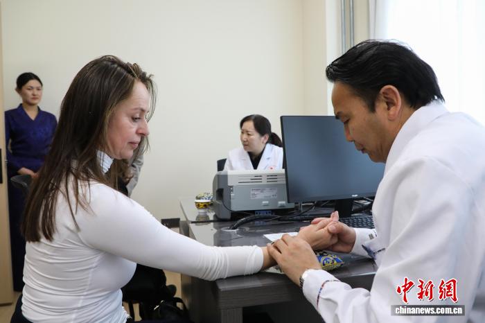 4月5日,青海西寧,奧地利中國友好協(xié)會高級代表團一行先后前往藏傳佛教圣地塔爾寺和青海省藏醫(yī)院感知青海藏文化。圖為代表團成員(左)在青海省藏醫(yī)院體驗特色診療。中新社記者 馬銘言 攝