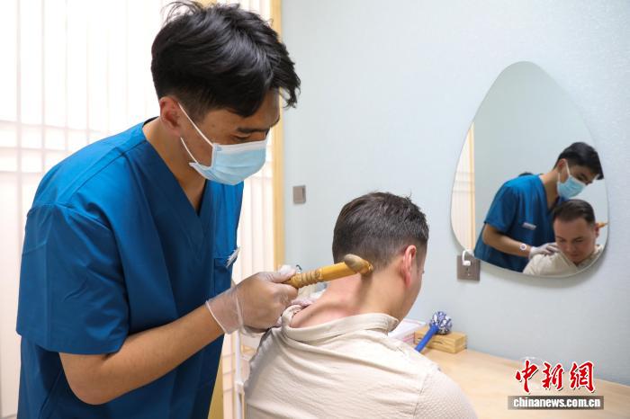 4月5日,青海西寧,奧地利中國友好協(xié)會高級代表團一行先后前往藏傳佛教圣地塔爾寺和青海省藏醫(yī)院感知青海藏文化。圖為代表團成員體驗藏醫(yī)尤闕療法。中新社記者 馬銘言 攝