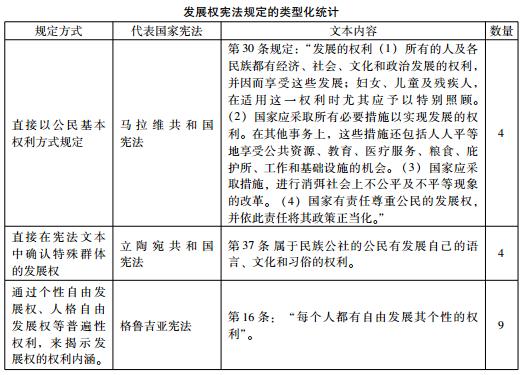 ?、迗D表所統(tǒng)計的有關發(fā)展權的條款,是以明顯出現發(fā)展字樣,或包含明顯的發(fā)展含義的條款為標準的。但實際上,根據憲法理論,即使在經濟、社會和文化權條款中沒有出現發(fā)展字樣或類似的表述,隨著權利保障標準的不斷提升,以及保障幅度的擴大,與發(fā)展權的權利要求是一致的。因而,可以認為,目前一國憲法中,只要包含有經濟、社會和文化權利條款,也就同時可以容納發(fā)展權的內容。