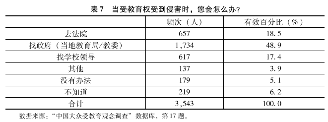 總體而言,盡管在選擇具體救濟途徑上,不同年齡、性質、職業(yè)、受教育程度的群體之間略有差異,但民眾受教育權受侵害時會選擇的主要救濟渠道都是去找政府尋求相關部門的行政救濟以及去找法院尋求司法救濟,政府機關和法院成為中國民眾受教育權法律救濟的主要渠道。
