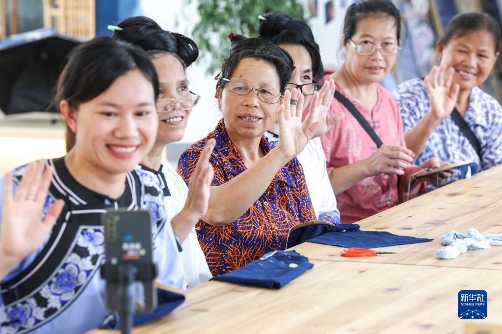 6月23日,在貴州省黔東南苗族侗族自治州榕江縣特和社區(qū)“母親回家手工坊直播中心”內(nèi),主播王洪丹(左一)與當(dāng)?shù)乩C娘和直播間里的觀眾打招呼。新華社記者 歐東衢 攝