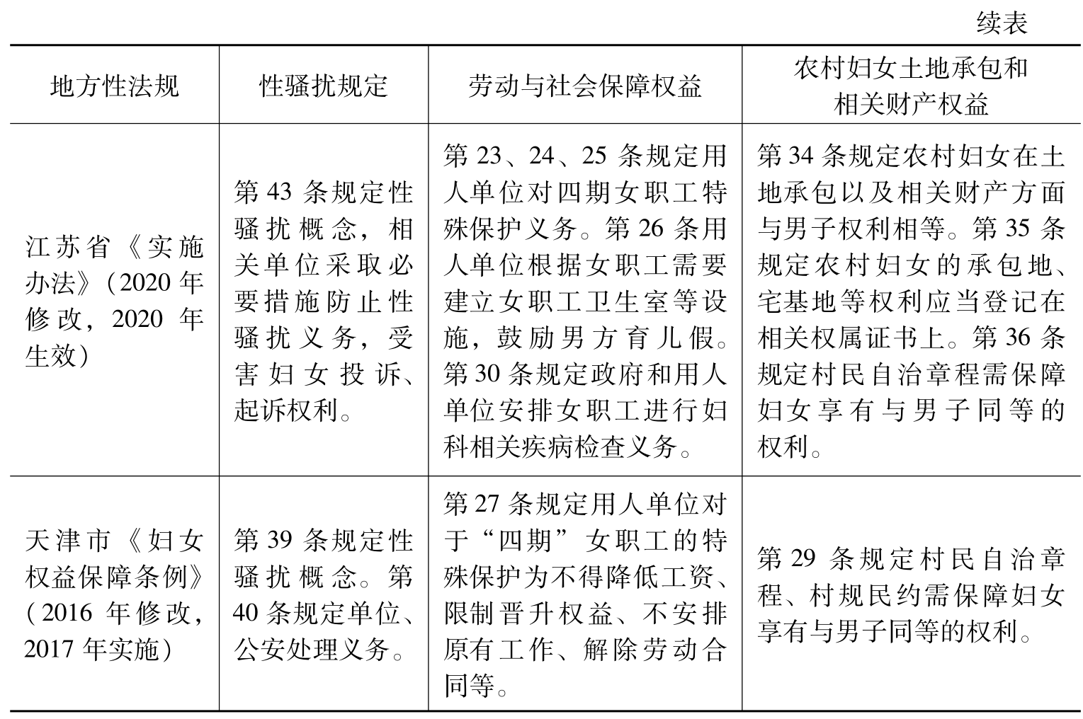 我國(guó)現(xiàn)有關(guān)于婦女權(quán)利保障的行政法規(guī)有《特別規(guī)定》等,相較《婦女法》等基本法,這些法規(guī)規(guī)章條款更為具體細(xì)致,司法適用性更強(qiáng)。同時(shí),我國(guó)地方文化經(jīng)濟(jì)等差異決定了統(tǒng)一立法難以完全照顧到不同的地方具體情況,地方可根據(jù)上位法結(jié)合本地情況制定實(shí)施辦法。地方立法一方面需要符合上位法的基本精神,在不與《婦女法》等上位法或行政法規(guī)相抵觸的前提下,將國(guó)家有關(guān)制度和規(guī)定細(xì)化為更加符合地方實(shí)際,更具有針對(duì)性、可操作性、可執(zhí)行性的條文。另一方面,各地實(shí)施辦法修訂工作應(yīng)積極吸納理論界最新研究和實(shí)務(wù)界最新探索,在立法模式、章節(jié)架構(gòu)、制度創(chuàng)新方面可以作出比統(tǒng)一法更為大膽的嘗試。但是,囿于上位法的滯后和轄制,下位規(guī)章和辦法嘗試創(chuàng)新和突破時(shí)又容易陷入整體優(yōu)化乏力的困境,一定程度上對(duì)《婦女法》修訂完善工作形成倒逼態(tài)勢(shì)。地方創(chuàng)新性立法是滿足地方發(fā)展需求,實(shí)現(xiàn)地方治理法治化的必由之路。地方為中央立法發(fā)揮先行先試、立法“試驗(yàn)田”的作用,為正式立法積累了經(jīng)驗(yàn)、創(chuàng)造了條件,有助于完善社會(huì)主義法治體系?!读⒎ǚā窞榈胤搅⒎ㄏ刃邢仍囂峁┝朔梢罁?jù)。如下表所示,近年一些地方實(shí)施辦法已經(jīng)先行進(jìn)行了修訂,新增和更新內(nèi)容主要集中在性騷擾防治、勞動(dòng)與社會(huì)保障權(quán)益、農(nóng)村婦女土地承包、其他財(cái)產(chǎn)權(quán)益等糾紛矛盾較多的四個(gè)方面。