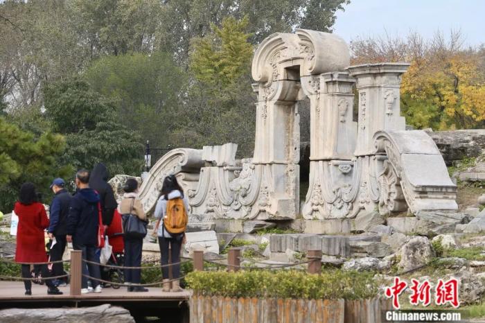 2021年10月18日,游客在北京圓明園遺址公園內參觀大水法。當日是圓明園罹難161周年紀念日。易海菲 攝