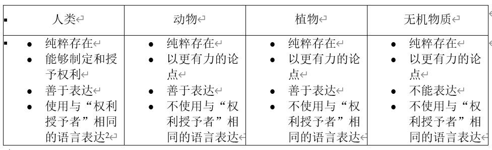 以動(dòng)態(tài)方式解釋這一點(diǎn),意味著人類作為社會(huì)存在,漸漸地將自己融入自然之中,不僅認(rèn)識(shí)到而且承認(rèn)了對(duì)自然的依賴,這至關(guān)重要。因此,人類在法律意義上仍然是唯一的主體,但他們也認(rèn)識(shí)到自己是那些無(wú)法為自己辯護(hù)的人的法定代表。因此,特別是對(duì)于人權(quán)法來(lái)說(shuō),改變對(duì)法律主體的理解是合理的。到目前為止,我們有: