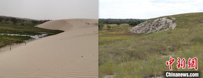 (資料圖)圖為綜合治理前后,錫林郭勒盟正藍(lán)旗那日圖蘇木巴彥塔拉嘎查2019年(左)和2022年(右)的對比圖。錫林郭勒盟正藍(lán)旗林草局供圖
