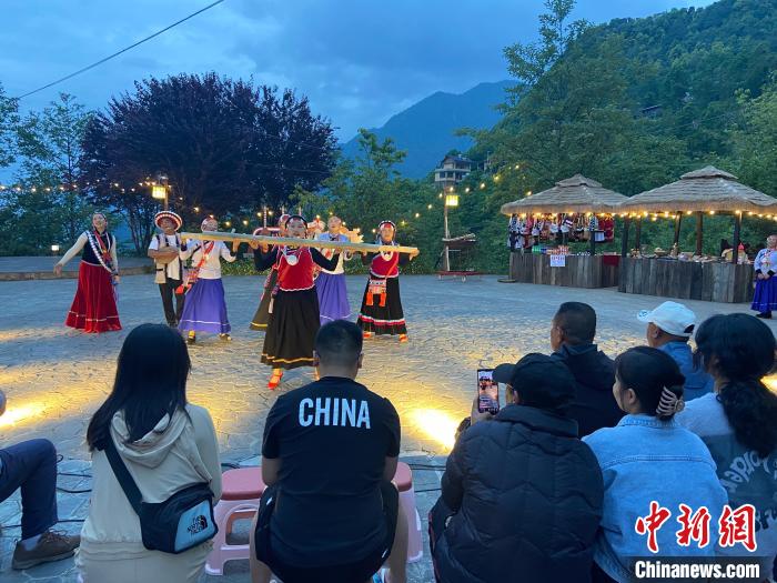 有了這首歌后,夫妻倆就在當?shù)卣闹С窒?,把村莊廣場改造成“老姆登之夜”民族文化集市。每當夜幕降臨,村民們就會集體演出,各民族歌舞輪番上演。其間,有怒族達比亞舞、民歌哦得得,傈僳族的口弦樂等非遺表演。最后,在村民的盛情邀請下,游客們紛紛加入其中,圍著篝火起舞。