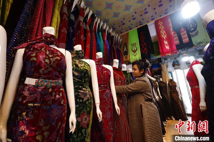 祖熱古麗·艾孜然提在自己的絲綢店中整理商品。中新社記者 韓海丹 攝
