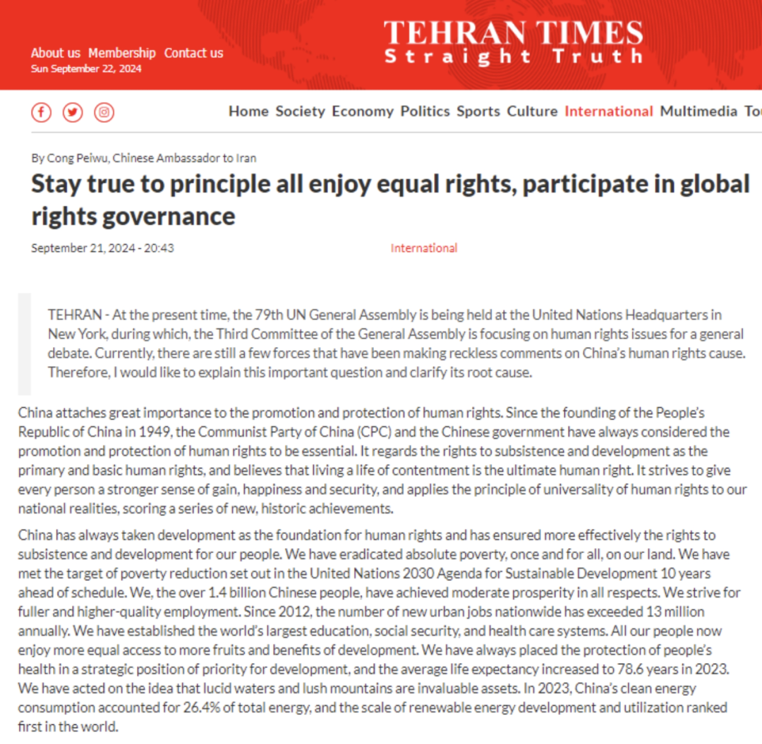 2024年9月21日,《德黑蘭時(shí)報(bào)》發(fā)表中國(guó)駐伊朗大使叢培武的署名文章《堅(jiān)持平等共享人權(quán),積極參與國(guó)際人權(quán)治理》。全文如下: