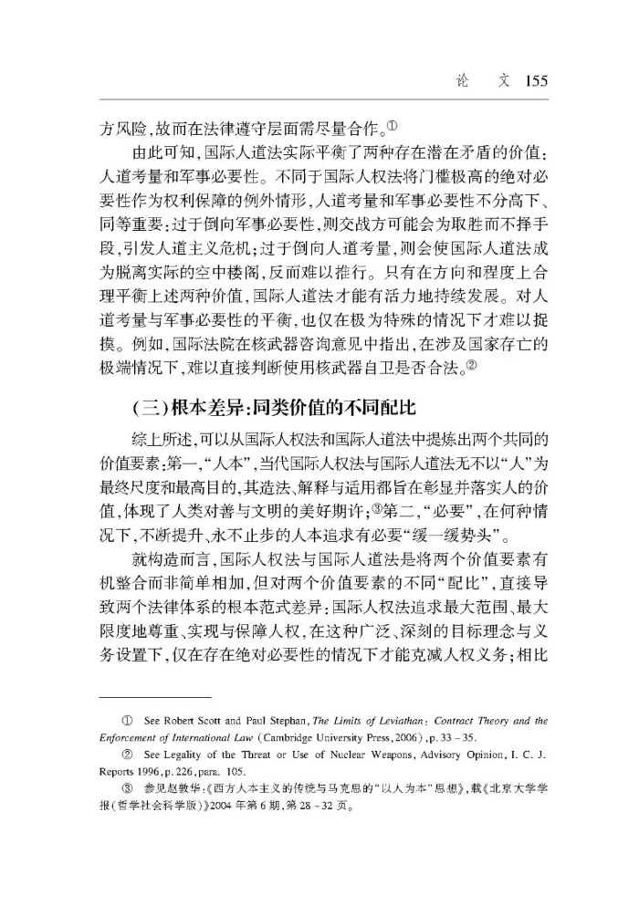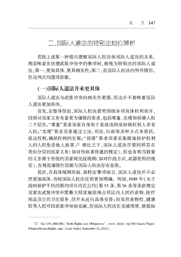 【摘要】近數(shù)十年來,武裝沖突中國際人權(quán)法與國際人道法重疊適用的現(xiàn)象持續(xù)存在,也使二者在具體事項上難以避免規(guī)范沖突。對此,較具代表性的處置方法是,國際法院將國際人道法作為國際人權(quán)法的特別法。但歷史表明,二者只是關(guān)系密切、存在重疊、協(xié)同發(fā)展的不同法律體系。在規(guī)范層面,相較于國際人權(quán)法,國際人道法既非更加具體也非例外情形,不能整體上被視為特別法。在價值層面,國際人權(quán)法與國際人道法均以人本為旨向,前者只在絕對必要的情況下才可能克減,后者則需同等地權(quán)衡、兼顧軍事必要與人道考量。這種差異也表明,在規(guī)范沖突中,國際人道法并非當然地優(yōu)先于國際人權(quán)法適用,關(guān)鍵在于是否存在具體明確的軍事必要性。
