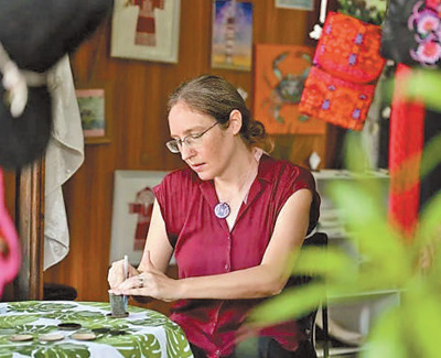 謝敏來(lái)自美國(guó)芝加哥,曾是一名英語(yǔ)老師的她,如今稱(chēng)自己為設(shè)計(jì)師、小店店主。謝敏的小店叫“海島樂(lè)趣”,位于海南??诎咨抽T(mén)公園內(nèi)。“這是五指山市的黎錦手提包,這是保亭村子里的織品,那幾件是東方市的。”店里擺放的黎錦作品出自海南各地村民之手,謝敏如數(shù)家珍。店中還有不少她親手設(shè)計(jì)和制作的文創(chuàng)產(chǎn)品,靈感都來(lái)自魚(yú)、烏龜、閃電等傳統(tǒng)黎錦紋樣。