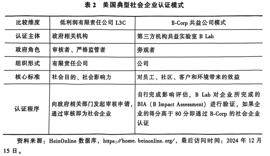 美國的社會企業(yè)組織形態(tài)基于其成熟的市場經(jīng)濟(jì)體制以及信息披露制度,營利性公司是其認(rèn)證出發(fā)點(diǎn)。具體來看,共益公司B-Corp模式的社會企業(yè)認(rèn)證標(biāo)準(zhǔn)寬松,主要關(guān)注企業(yè)行為的社會效益,包括員工、社區(qū)、客戶、環(huán)境等多方面。因此從某種角度而言,其認(rèn)證通過的企業(yè)僅是履行社會責(zé)任的企業(yè),能否稱之為“社會企業(yè)”存在爭議。美國L3C模式的社會企業(yè)認(rèn)證標(biāo)準(zhǔn)相對嚴(yán)格,雖然仍屬于有限責(zé)任公司,但其成立必須出于慈善和教育目的,以實(shí)現(xiàn)社會目標(biāo)為主,其次才是營利。具體可見表2。