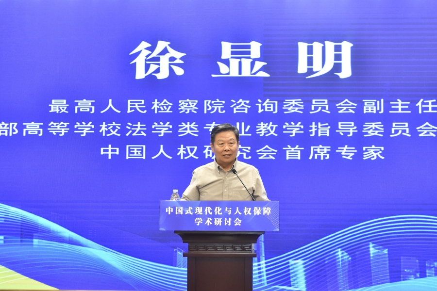“中國式現(xiàn)代化與人權(quán)保障”學(xué)術(shù)研討會16日在山東濟南舉行。圖為最高人民檢察院咨詢委員會副主任、教育部高等學(xué)校法學(xué)類專業(yè)教學(xué)指導(dǎo)委員會主任委員、中國人權(quán)研究會首席專家徐顯明在開幕式上致辭。主辦方供圖