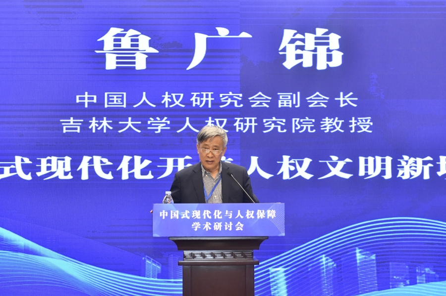 “中國(guó)式現(xiàn)代化與人權(quán)保障”學(xué)術(shù)研討會(huì)16日在山東濟(jì)南舉行。圖為中國(guó)人權(quán)研究會(huì)副會(huì)長(zhǎng)、吉林大學(xué)人權(quán)研究院教授魯廣錦作題為《中國(guó)式現(xiàn)代化開辟人權(quán)文明新境界》的主旨演講。主辦方供圖