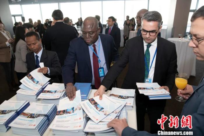 當?shù)貢r間2023年4月19日,“全球發(fā)展倡議新進展 可持續(xù)發(fā)展議程新行動”主題展覽在紐約聯(lián)合國總部舉行。圖為與會嘉賓取閱國合署發(fā)布的新報告——《國際發(fā)展合作的中國實踐》。中新社記者 廖攀 攝