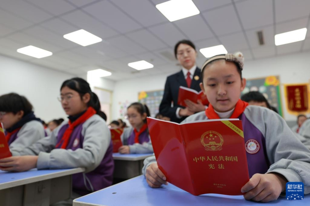 12月2日,在河北省邢臺(tái)市內(nèi)丘縣朝陽(yáng)小學(xué),內(nèi)丘縣人民檢察院檢察干警為學(xué)生講解憲法知識(shí)。新華社發(fā)(劉繼東攝)