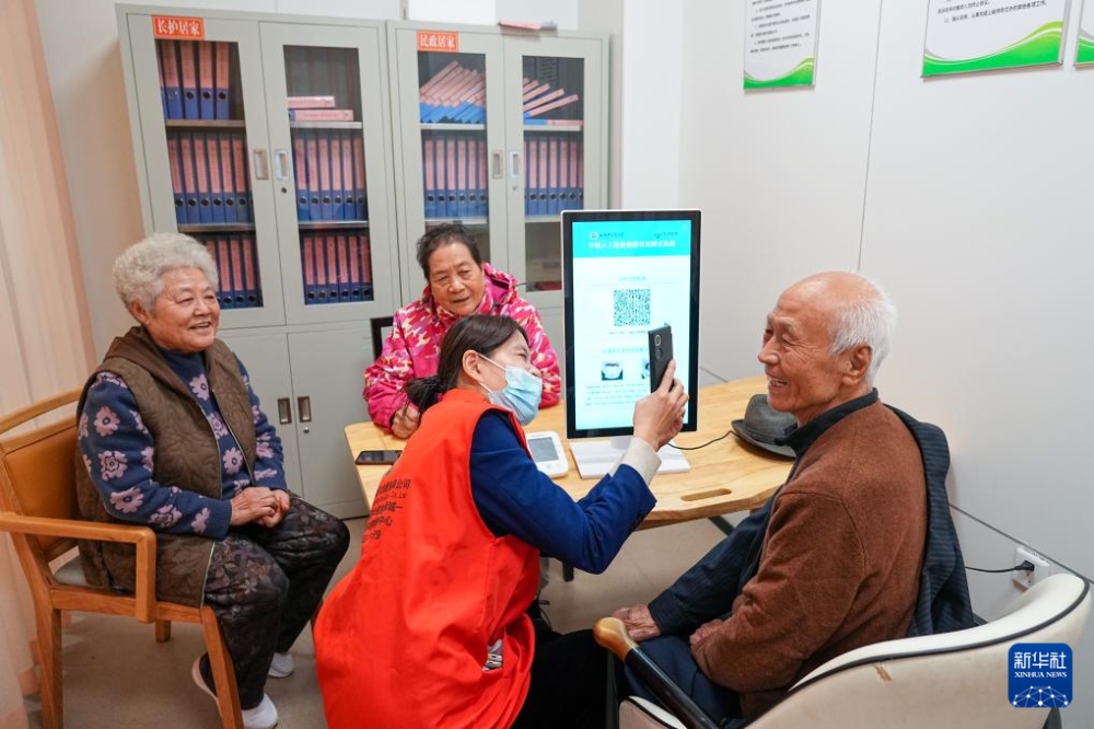 2025年10月23日,老人們在山東省淄博市張店區(qū)馬尚街道金石社區(qū)日間護理中心測量健康數(shù)據(jù)。中國特色養(yǎng)老服務體系正加速構建,每年為65歲以上老年人提供約1.4億人次健康管理服務。新華社記者 朱崢 攝