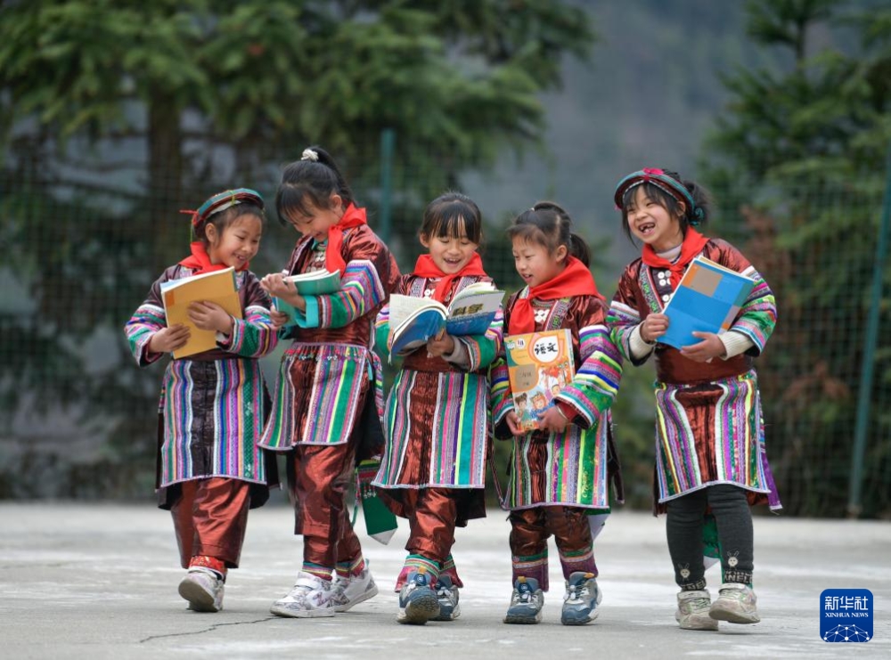 2023年2月16日,在貴州省從江縣西山鎮(zhèn)中寨教學點,領到新書的瑤族學生在一起交流。“十四五”時期,我國教育事業(yè)取得歷史性成就,義務教育全國2895個縣域?qū)崿F(xiàn)基本均衡。新華社記者 楊文斌 攝