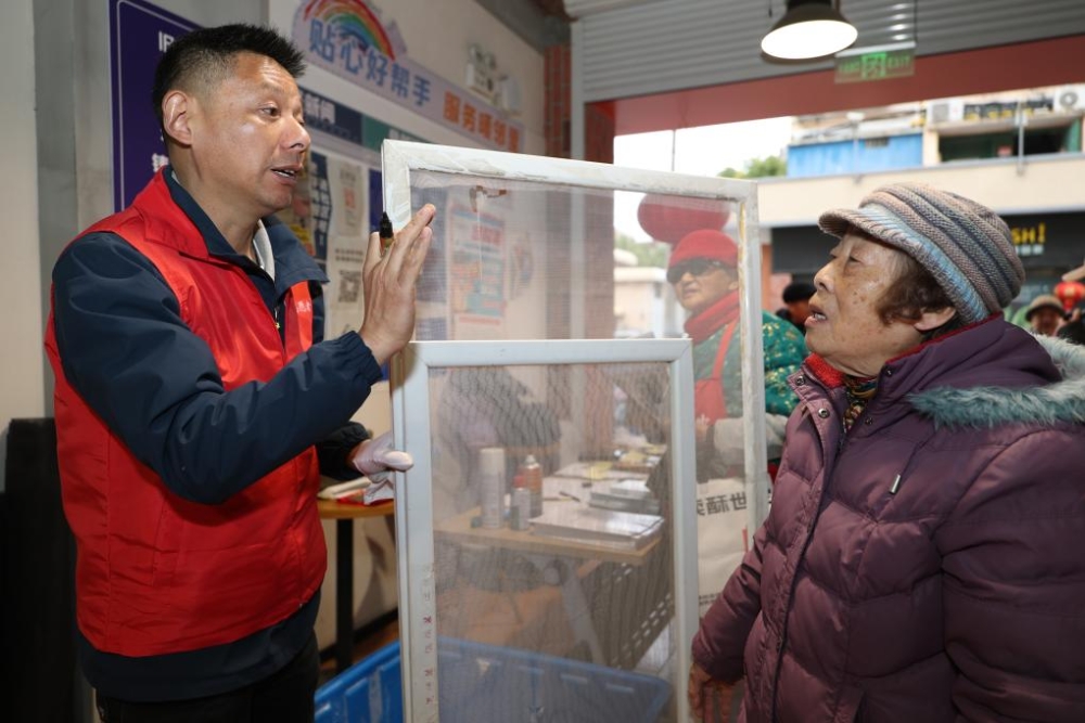 在3月初進行的“學(xué)雷鋒”活動中,楊茶生與需要換窗紗的老人溝通。新華社記者 王翔 攝