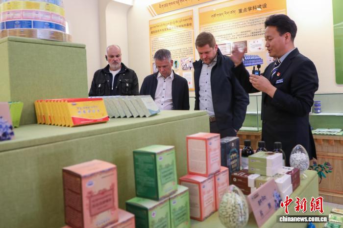 4月5日,青海西寧,奧地利中國友好協(xié)會高級代表團一行先后前往藏傳佛教圣地塔爾寺和青海省藏醫(yī)院感知青海藏文化。圖為代表團成員了解青海省藏醫(yī)院研制的藏藥。中新社記者 馬銘言 攝